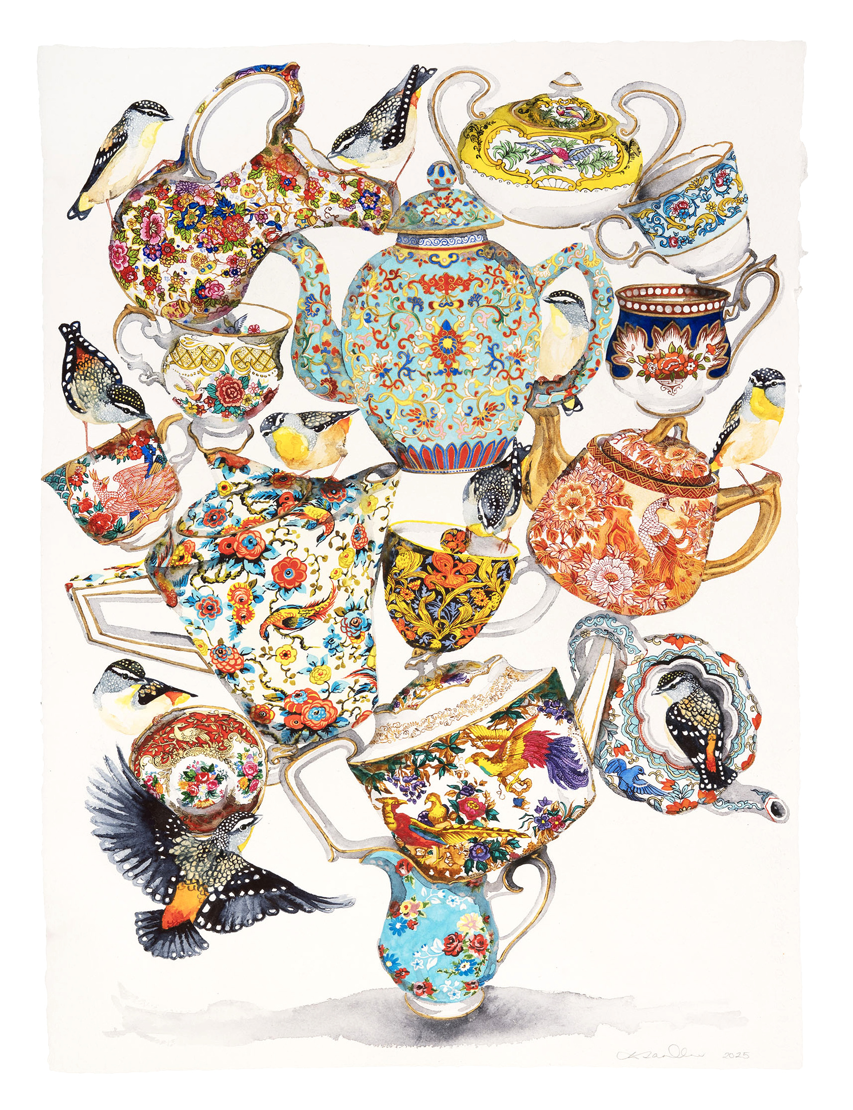 The spotted pardalote is often heard but rarely seen as they are often at the tops of trees eating lerp, only coming down to nest, often in an embankment where they build a long tunnel with a round chamber at the end for the nest, but they have also been known to nest in pool noodles or garage doors. I tried to provide a couple of alternate nesting ideas in my painting for them. They also often visit in a mixed flock with lots of other mini birds, such as thornbills and tree creepers. I have chosen porcelain pieces which feature birds in their decoration for them to hide amongst.
